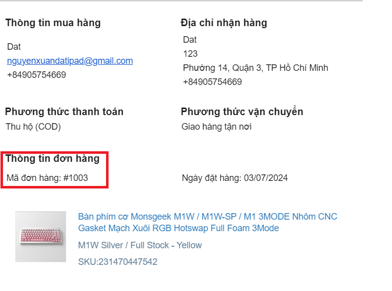 Sau khi đặt hàng sẽ có email của shop xác nhận đơn hàng, trong đó có mã đơn hàng, khách hàng vui lòng ghi cú pháp Mã + SĐT. Ví dụ: 1111 0905754669 (Nếu không có liên hệ shop để được hỗ trợ)