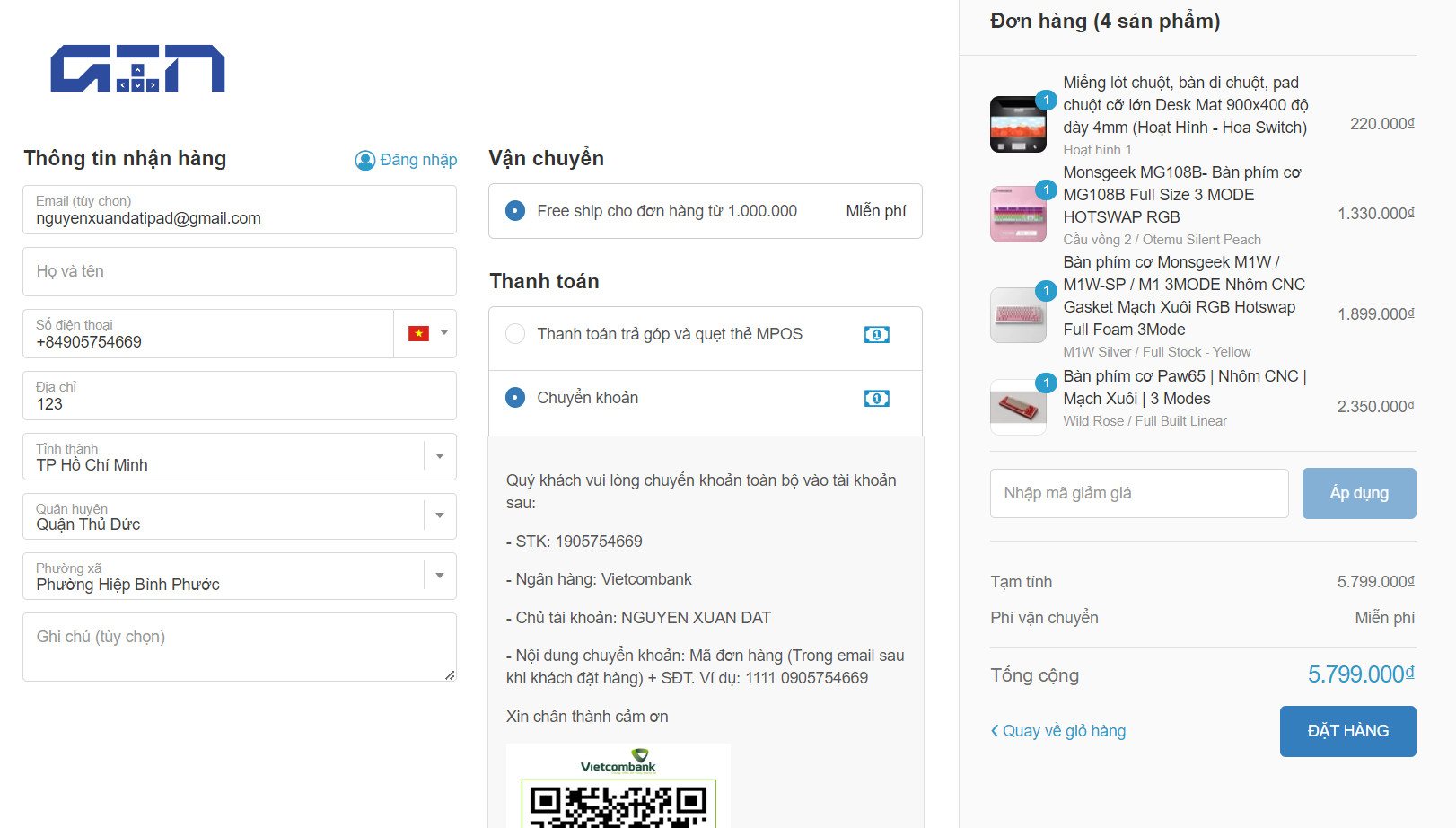 Tại giỏ hàng: Khách hàng cần điền thông tin email, họ tên, số điện thoại, địa chỉ, ghi chú để được xác nhận thanh toán